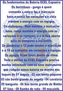 - Acreditamos que a prática da capoeira em sua essência, possibilita o homem a dar um grito de liberdade não só enquanto sistema mas também enquanto pessoa, aprofundando da nossa história e expansão de consciência, utilizando a maior ferramenta sócio-histórico-cultural da humanidade, a "mãe capoeira". As oligarquias tiveram exito em suas pretensões em moldar parte do nosso povo, até hoje se percebe o poder de domínio e manipulação desses canibais imperialistas, quantos bandos de bandeirantes requintados que ainda caçam e destroem culturas de povos inteiros em virtude dos lucros que é seu único e exclusivo fim, acorrentam, oprimem e castigam nosso povo, com perversidades e humilhações a cada dia mais variadas. Em contrapartida a ECEL CAPOEIRA atua na formação de mentalidades construtoras e libertadoras, fundamentados no autoconhecimento pessoal e cultural, somados ao respeito sagrado a natureza... Rompendo os laços que nos une a condição de serviçais, com a força de nossa própria cultura.Vida longa, livre, saudável, digna e honrada. Mestre Cipó Cristino Júnior (61) 9851-6028 / 8570-4673